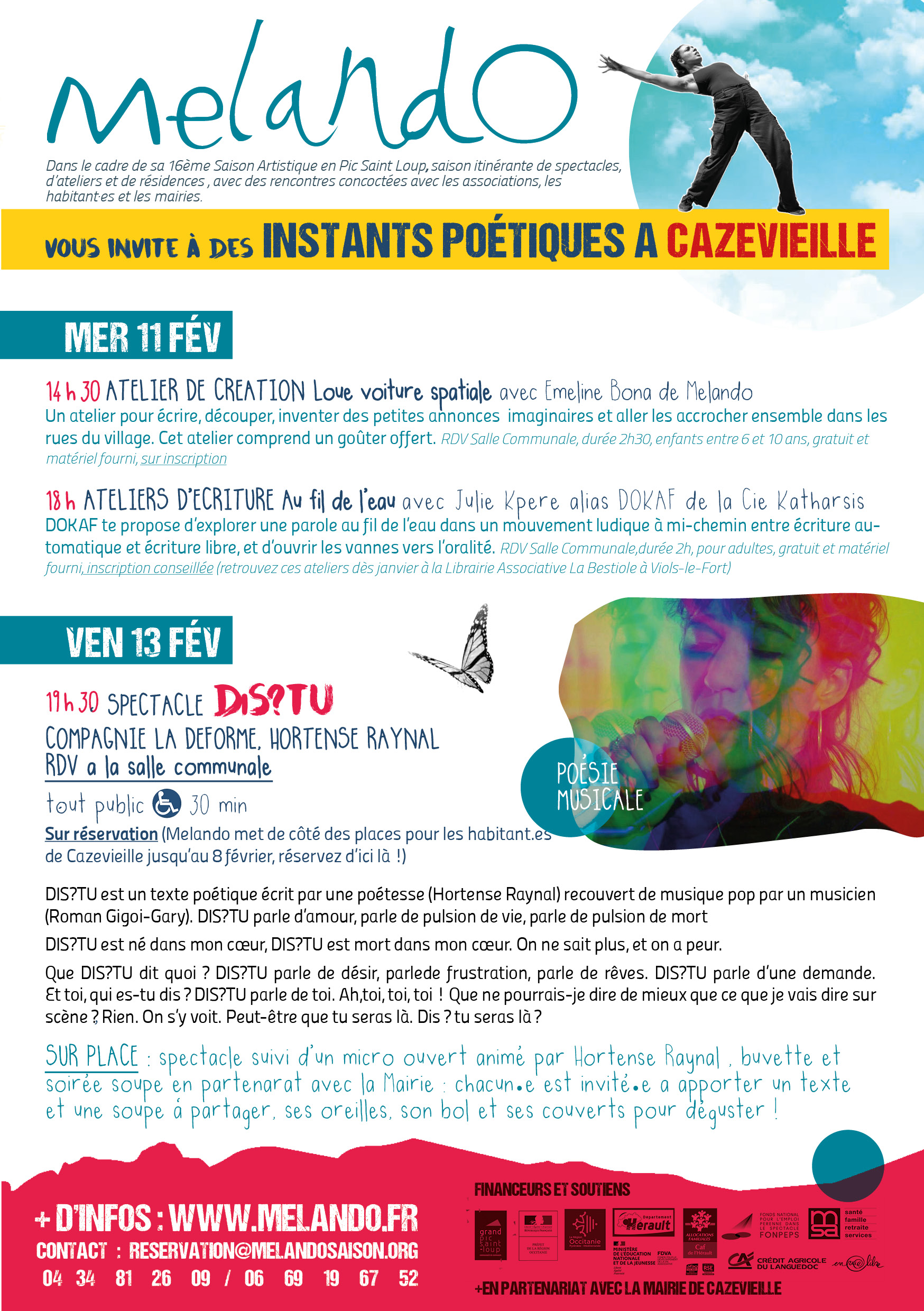 Téléchargez le programmePour une reprise en douceur, Melando vous invite à vous laisser emporter par des mouvements poétiques en écoutant, en écrivant, en exprimant des mots qui riment, se rythment, s'entrechoquent, se répondent, s'entremêlent.