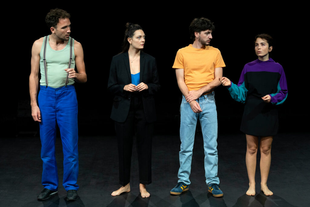Sur scène, quatre jeunes artistes exposent, avec distance et humour, leur propre rapport à l’art dramatique. Ils explorent les ressorts de l’illusion, rejouent des scènes mythiques extraites d’œuvres célèbres, s’adonnent à de faux combats, s’échangent des baisers de cinéma…